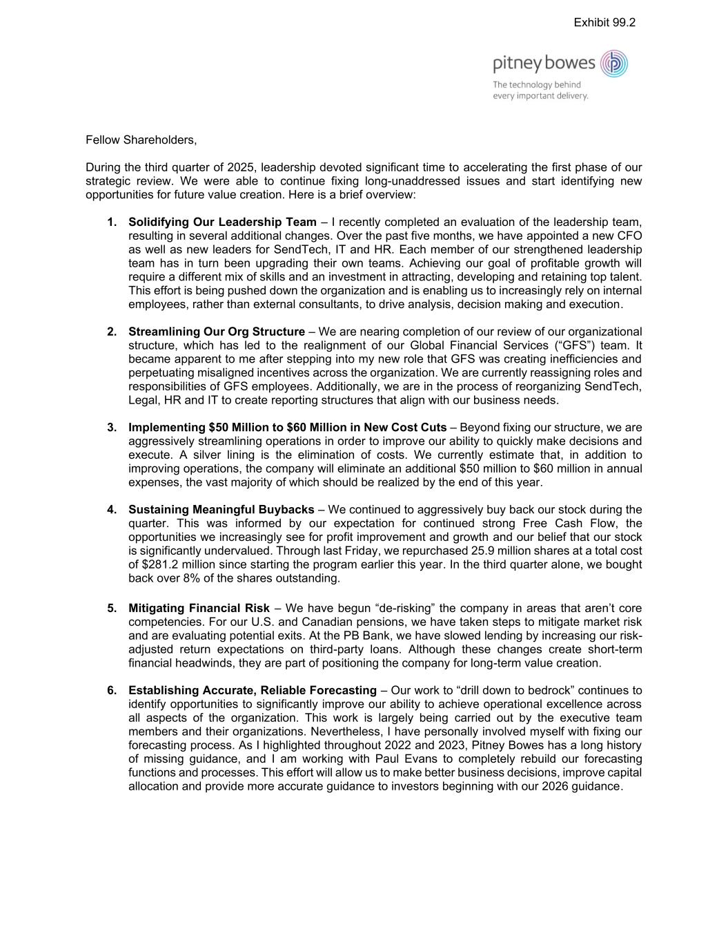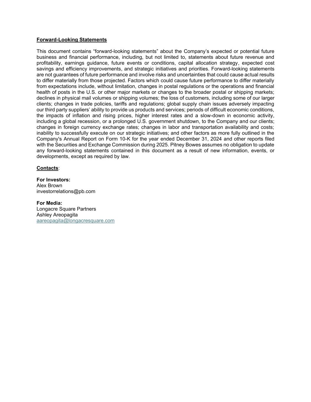 Forward-Looking Statements This document contains “forward-looking statements” about the Company’s expected or potential future business and financial performance, including, but not limited to, statements about future revenue and profitability, earnings guidance, future events or conditions, capital allocation strategy, expected cost savings and efficiency improvements, and strategic initiatives and priorities. Forward-looking statements are not guarantees of future performance and involve risks and uncertainties that could cause actual results to differ materially from those projected. Factors which could cause future performance to differ materially from expectations include, without limitation, changes in postal regulations or the operations and financial health of posts in the U.S. or other major markets or changes to the broader postal or shipping markets; declines in physical mail volumes or shipping volumes; the loss of customers, including some of our larger clients; changes in trade policies, tariffs and regulations; global supply chain issues adversely impacting our third party suppliers’ ability to provide us products and services; periods of difficult economic conditions, the impacts of inflation and rising prices, higher interest rates and a slow-down in economic activity, including a global recession, or a prolonged U.S. government shutdown, to the Company and our clients; changes in foreign currency exchange rates; changes in labor and transportation availability and costs; inability to successfully execute on our strategic initiatives; and other factors as more fully outlined in the Company's Annual Report on Form 10-K for the year ended December 31, 2024 and other reports filed with the Securities and Exchange Commission during 2025. Pitney Bowes assumes no obligation to update any forward-looking statements contained in this document as a result of new information, events, or developments, except as required by law. Contacts: For Investors: Alex Brown investorrelations@pb.com For Media: Longacre Square Partners Ashley Areopagita aareopagita@longacresquare.com