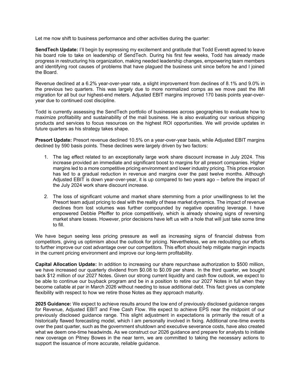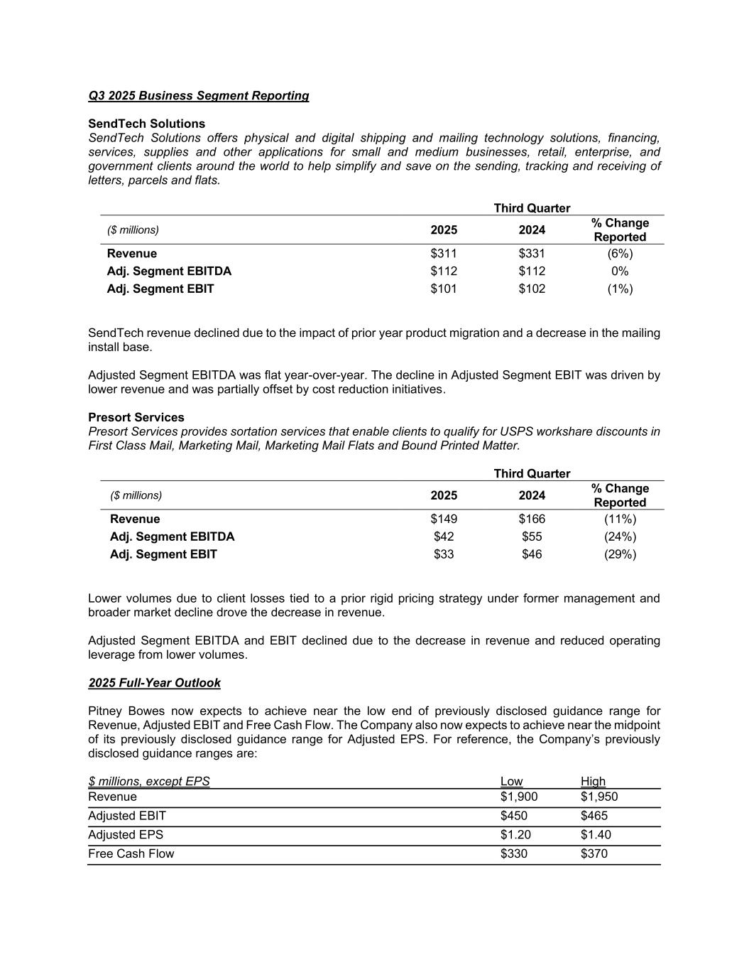 Q3 2025 Business Segment Reporting SendTech Solutions SendTech Solutions offers physical and digital shipping and mailing technology solutions, financing, services, supplies and other applications for small and medium businesses, retail, enterprise, and government clients around the world to help simplify and save on the sending, tracking and receiving of letters, parcels and flats. Third Quarter ($ millions) 2025 2024 % Change Reported Revenue $311 $331 (6%) Adj. Segment EBITDA $112 $112 0% Adj. Segment EBIT $101 $102 (1%) SendTech revenue declined due to the impact of prior year product migration and a decrease in the mailing install base. Adjusted Segment EBITDA was flat year-over-year. The decline in Adjusted Segment EBIT was driven by lower revenue and was partially offset by cost reduction initiatives. Presort Services Presort Services provides sortation services that enable clients to qualify for USPS workshare discounts in First Class Mail, Marketing Mail, Marketing Mail Flats and Bound Printed Matter. Third Quarter ($ millions) 2025 2024 % Change Reported Revenue $149 $166 (11%) Adj. Segment EBITDA $42 $55 (24%) Adj. Segment EBIT $33 $46 (29%) Lower volumes due to client losses tied to a prior rigid pricing strategy under former management and broader market decline drove the decrease in revenue. Adjusted Segment EBITDA and EBIT declined due to the decrease in revenue and reduced operating leverage from lower volumes. 2025 Full-Year Outlook Pitney Bowes now expects to achieve near the low end of previously disclosed guidance range for Revenue, Adjusted EBIT and Free Cash Flow. The Company also now expects to achieve near the midpoint of its previously disclosed guidance range for Adjusted EPS. For reference, the Company’s previously disclosed guidance ranges are: $ millions, except EPS Low High Revenue $1,900 $1,950 Adjusted EBIT $450 $465 Adjusted EPS $1.20 $1.40 Free Cash Flow $330 $370