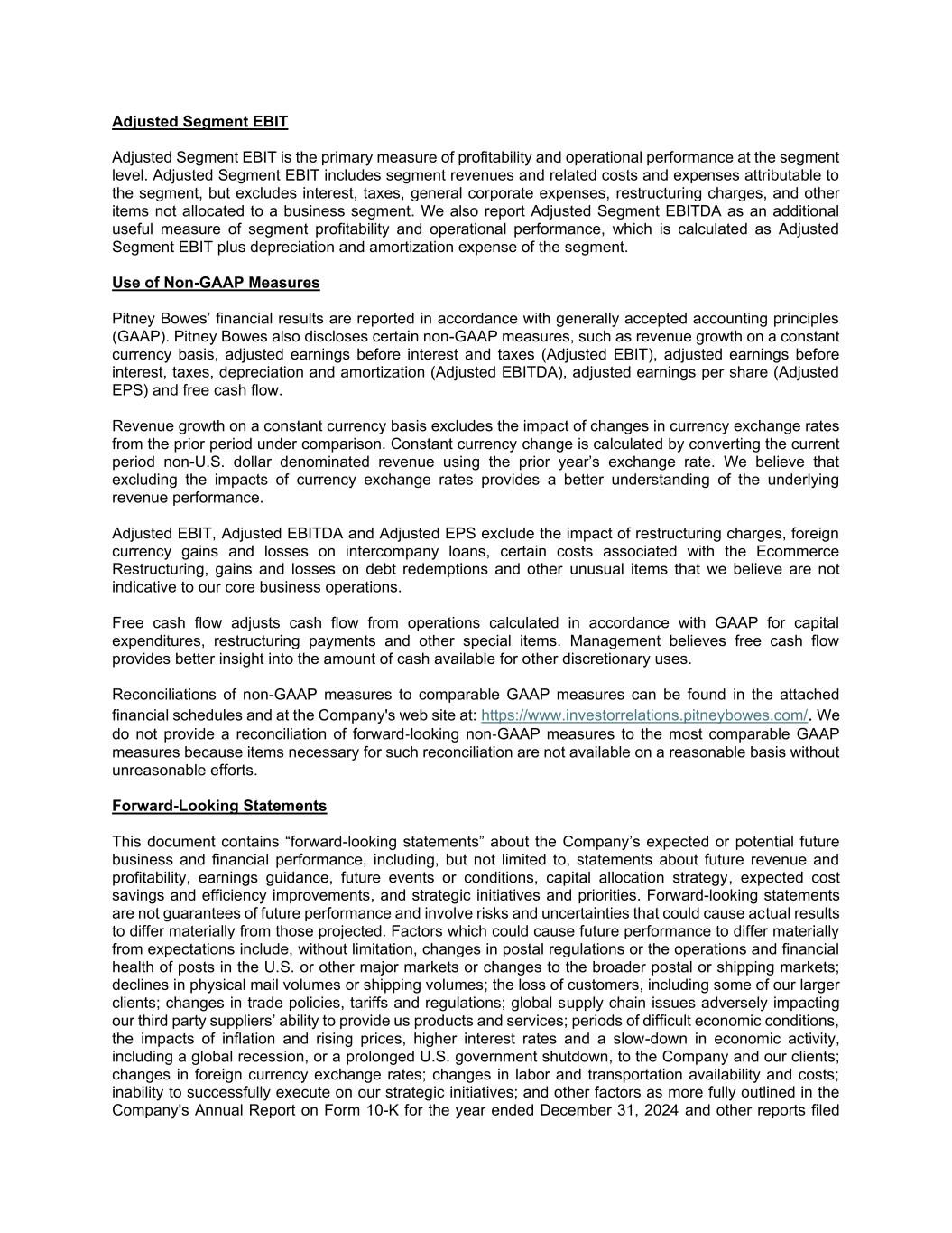 Q3 2025 Earnings Conference Call Management will discuss the Company’s results in a webcast today at 5:00 p.m. ET. Instructions for accessing the earnings results call are available on the Investor Relations page of the Company’s website at www.pitneybowes.com. About Pitney Bowes Pitney Bowes (NYSE: PBI) is a technology-driven company that provides digital shipping solutions, mailing innovation, and financial services to clients around the world – including more than 90 percent of the Fortune 500. Small businesses to large enterprises, and government entities rely on Pitney Bowes to reduce the complexity of sending mail and parcels. For the latest news, corporate announcements, and financial results, visit www.pitneybowes.com/us/newsroom. For additional information, visit Pitney Bowes at www.pitneybowes.com. Adjusted Segment EBIT Adjusted Segment EBIT is the primary measure of profitability and operational performance at the segment level. Adjusted Segment EBIT includes segment revenues and related costs and expenses attributable to the segment, but excludes interest, taxes, general corporate expenses, restructuring charges, and other items not allocated to a business segment. We also report Adjusted Segment EBITDA as an additional useful measure of segment profitability and operational performance, which is calculated as Adjusted Segment EBIT plus depreciation and amortization expense of the segment. Use of Non-GAAP Measures Pitney Bowes’ financial results are reported in accordance with generally accepted accounting principles (GAAP). Pitney Bowes also discloses certain non-GAAP measures, such as revenue growth on a constant currency basis, adjusted earnings before interest and taxes (Adjusted EBIT), adjusted earnings before interest, taxes, depreciation and amortization (Adjusted EBITDA), adjusted earnings per share (Adjusted EPS) and free cash flow. Revenue growth on a constant currency basis excludes the impact of changes in currency exchange rates from the prior period under comparison. Constant currency change is calculated by converting the current period non-U.S. dollar denominated revenue using the prior year’s exchange rate. We believe that excluding the impacts of currency exchange rates provides a better understanding of the underlying revenue performance. Adjusted EBIT, Adjusted EBITDA and Adjusted EPS exclude the impact of restructuring charges, foreign currency gains and losses on intercompany loans, certain costs associated with the Ecommerce Restructuring, gains and losses on debt redemptions and other unusual items that we believe are not indicative to our core business operations. Free cash flow adjusts cash flow from operations calculated in accordance with GAAP for capital expenditures, restructuring payments and other special items. Management believes free cash flow provides better insight into the amount of cash available for other discretionary uses. Reconciliations of non-GAAP measures to comparable GAAP measures can be found in the attached financial schedules and at the Company's web site at: https://www.investorrelations.pitneybowes.com/. We do not provide a reconciliation of forward‑looking non‑GAAP measures to the most comparable GAAP measures because items necessary for such reconciliation are not available on a reasonable basis without unreasonable efforts.
