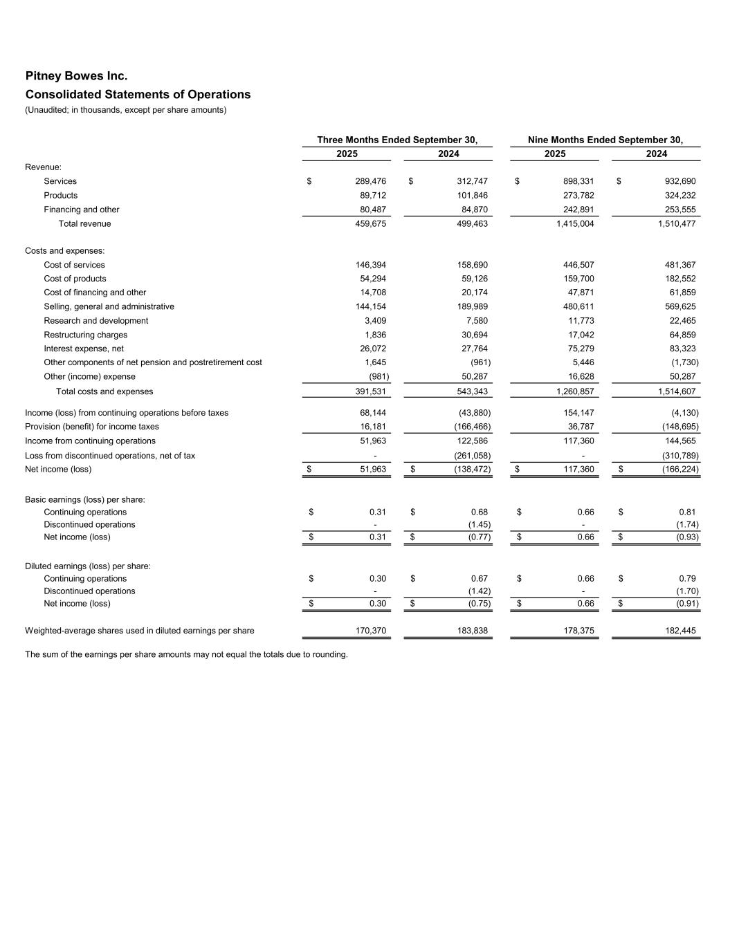 Pitney Bowes Inc. Consolidated Statements of Operations (Unaudited; in thousands, except per share amounts) 2025 2024 2025 2024 Revenue: Services 289,476$ 312,747$ 898,331$ 932,690$ Products 89,712 101,846 273,782 324,232 Financing and other 80,487 84,870 242,891 253,555 Total revenue 459,675 499,463 1,415,004 1,510,477 Costs and expenses: Cost of services 146,394 158,690 446,507 481,367 Cost of products 54,294 59,126 159,700 182,552 Cost of financing and other 14,708 20,174 47,871 61,859 Selling, general and administrative 144,154 189,989 480,611 569,625 Research and development 3,409 7,580 11,773 22,465 Restructuring charges 1,836 30,694 17,042 64,859 Interest expense, net 26,072 27,764 75,279 83,323 Other components of net pension and postretirement cost 1,645 (961) 5,446 (1,730) Other (income) expense (981) 50,287 16,628 50,287 Total costs and expenses 391,531 543,343 1,260,857 1,514,607 Income (loss) from continuing operations before taxes 68,144 (43,880) 154,147 (4,130) Provision (benefit) for income taxes 16,181 (166,466) 36,787 (148,695) Income from continuing operations 51,963 122,586 117,360 144,565 Loss from discontinued operations, net of tax - (261,058) - (310,789) Net income (loss) 51,963$ (138,472)$ 117,360$ (166,224)$ Basic earnings (loss) per share: Continuing operations 0.31$ 0.68$ 0.66$ 0.81$ Discontinued operations - (1.45) - (1.74) Net income (loss) 0.31$ (0.77)$ 0.66$ (0.93)$ Diluted earnings (loss) per share: Continuing operations 0.30$ 0.67$ 0.66$ 0.79$ Discontinued operations - (1.42) - (1.70) Net income (loss) 0.30$ (0.75)$ 0.66$ (0.91)$ Weighted-average shares used in diluted earnings per share 170,370 183,838 178,375 182,445 The sum of the earnings per share amounts may not equal the totals due to rounding. Nine Months Ended September 30,Three Months Ended September 30,