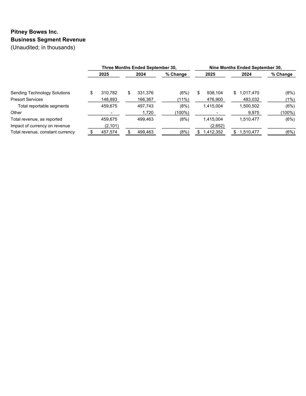 Pitney Bowes Inc. Business Segment Revenue (Unaudited; in thousands) 2025 2024 % Change 2025 2024 % Change Sending Technology Solutions 310,782$ 331,376$ (6%) 938,104$ 1,017,470$ (8%) Presort Services 148,893 166,367 (11%) 476,900 483,032 (1%) Total reportable segments 459,675 497,743 (8%) 1,415,004 1,500,502 (6%) Other - 1,720 (100%) - 9,975 (100%) Total revenue, as reported 459,675 499,463 (8%) 1,415,004 1,510,477 (6%) Impact of currency on revenue (2,101) (2,652) Total revenue, constant currency 457,574$ 499,463$ (8%) 1,412,352$ 1,510,477$ (6%) Three Months Ended September 30, Nine Months Ended September 30,